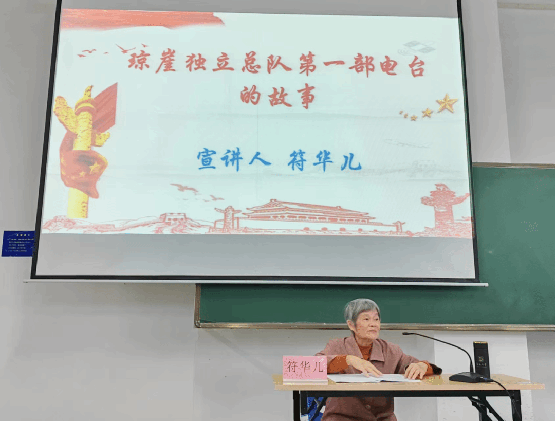 符华儿老师以“琼崖独立总队第一部电台的故事”为主题,讲述了其父亲符儒光先生年少投身革命、艰苦的战争经历以及冒着生命危险为琼崖总队护送电台的感人事迹。