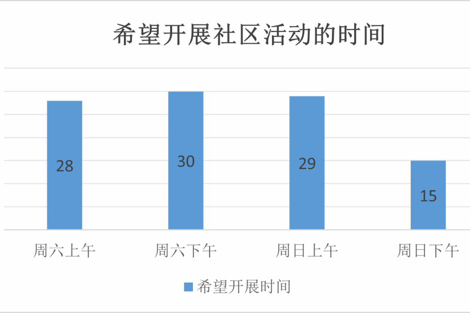 从希望开展社区活动的时间上看,受调查者普遍希望在周六上午、周六下午和周日上午开展活动,对周日下午开展活动的参与意愿可能较低。